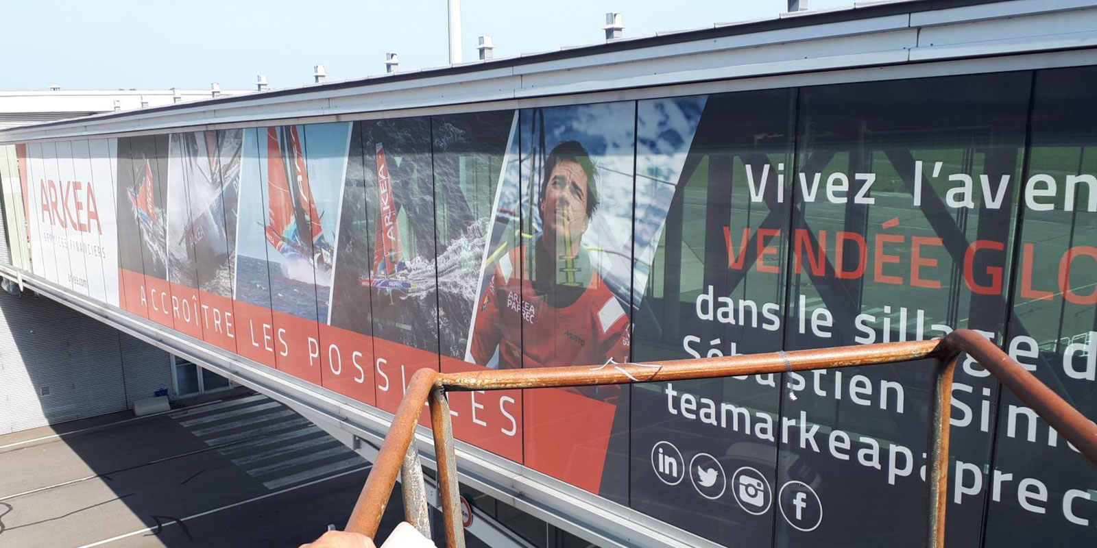 Ouestélio c’est aussi de la communication visuelle… « Prenons les airs et prenons le large » avec la pose de ce vinyle microperforé sur les passerelles de l’aéroport (avec notre partenaire Viarama pour Arkéa).