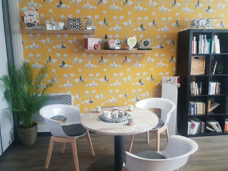 Nous utilisons un vinyle murale adhésif texturé et lavable